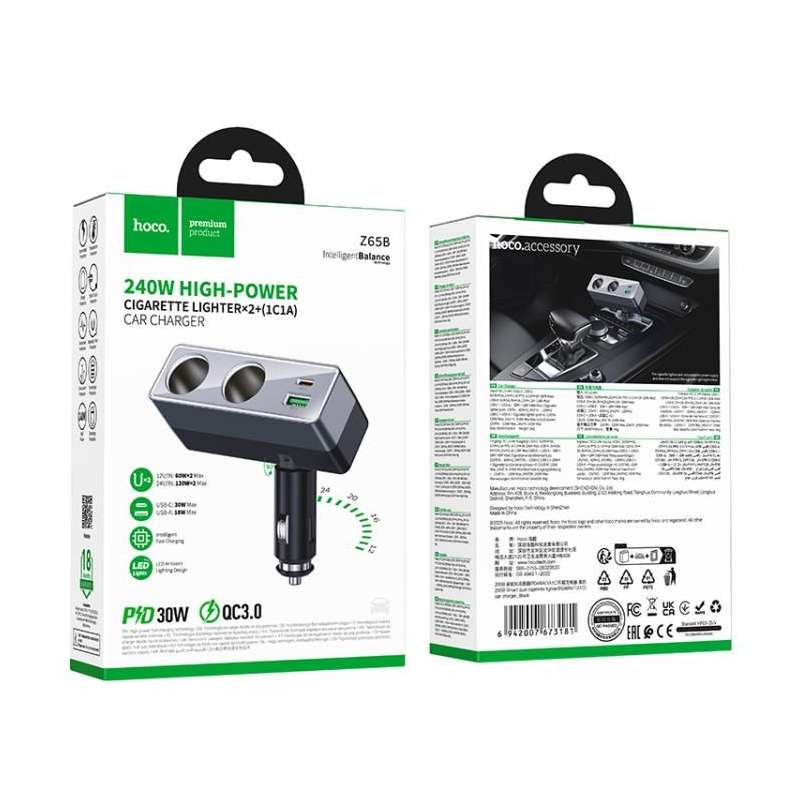Hoco Z65B - Φορτιστής Αυτοκινήτου με Διπλή Υποδοχή Αναπτήρα, 1 x USB-A και 1 x Type-C (PD QC 3.0 240W) σε Μαύρο Χρώμα | SPOTT.GR