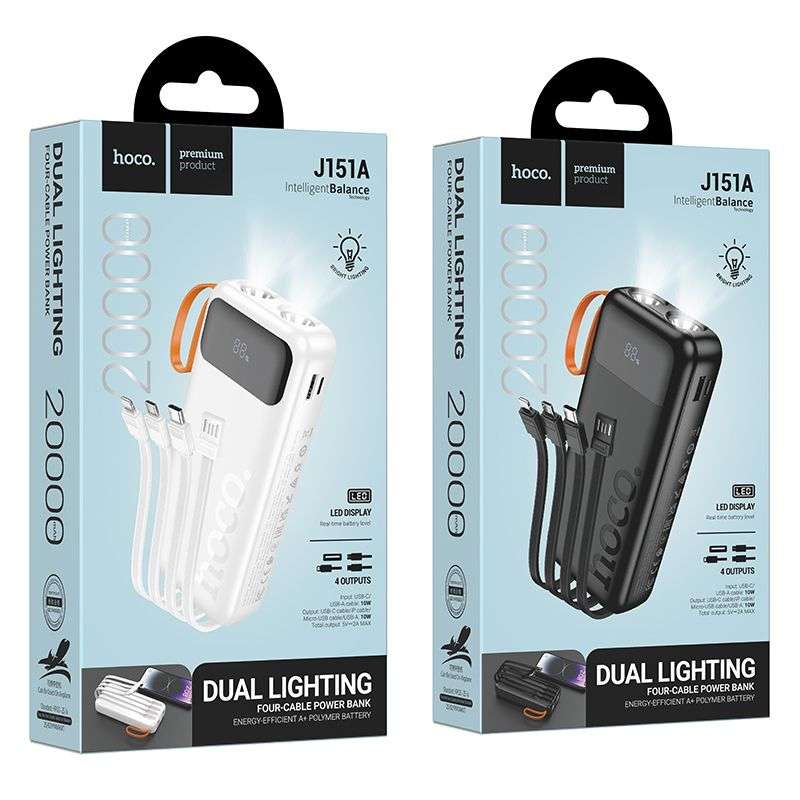Power Bank Hoco 20000mAh 2A με Ενσωματωμένα Καλώδια USB-A, Type-C, Lightning, Micro USB και Διπλό Φακό σε Μαύρο Χρώμα | SPOTT.GR